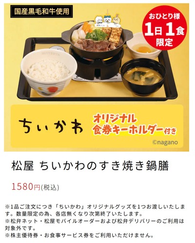 松屋、ちいかわのすき焼き鍋膳(キーホルダー付き)を発売。松屋「おひとり様一日一食限定です」