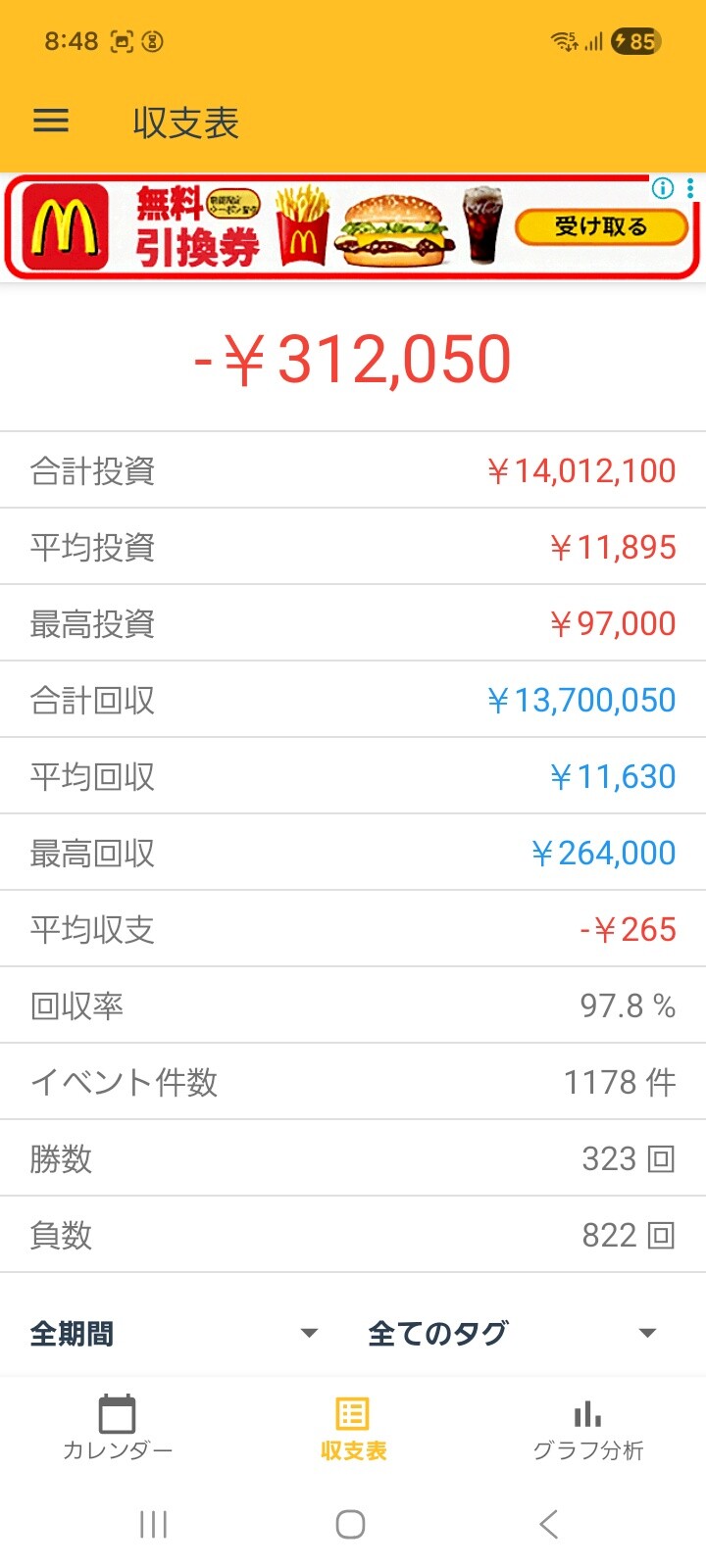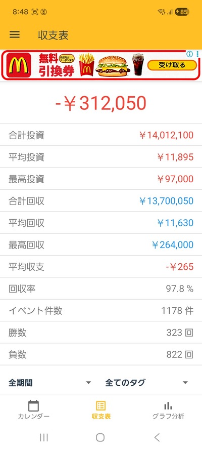 【画像】わいパチンカスが10年間真面目に収支を付けた結果www