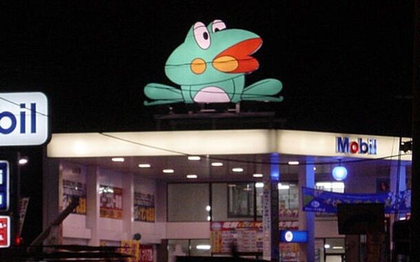ガソリンスタンドの上に山佐のカエルがあったんだが
